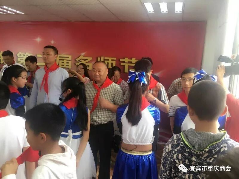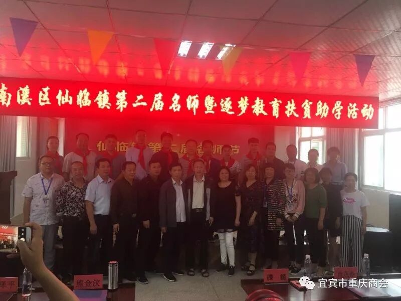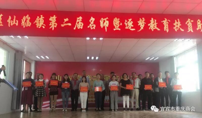 2018年6月1日,在宜宾市南溪区仙临镇中心学校会议室举办第二届名师表彰暨“逐梦”教育扶贫助学活动。南溪区教育和体育局领导朱红平、区防范办主任丁莉莎、区禁毒大队长刘星才;镇党领导仙临镇党委书记滕锴、仙临镇党委副书记、仙临镇人民政府镇长提名人选肖茂春、仙临镇人民政府副镇长,仙临镇逐梦教育扶贫助学基金秘书长李明华;以及社会各界爱心人士和南溪区受表彰的师生等参加了活动。 左起:副会长廖谋,会长杨泽平,副会长庹修国及爱心人士 宜宾市政协委员、民盟宜宾市经济支部委员、宜宾市重庆商会会长杨泽平,南溪区政协委员、宜宾市重庆商会副会长、宜宾市利豪生物科技有限公司董事长庹修国,宜宾市重庆商会副会长、宜宾市楚鼎商贸有限公司总经理廖谋代表我商会出席会议,送去商会全体会员的问候及慰问金。 活动进行中 孩子们为社会爱心人士佩戴红领巾 此次活动以“情溢校园激励园丁挥洒汗水驰骋三尺讲台,爱暖寒门呵护学子泼墨人生逐梦十年寒窗”为主题。为贯彻落实习近平总书记在十九大报告中提出的“优先发展教育事业”的精神,鼓励社会团体、企事业单位、民间组织关注教育,关心教师,关爱学生,营造尊师重教的良好社会氛围。进一步增强广大教师的荣誉感、责任感和使命感,进一步激励广大教师以先进模范为榜样,为人师表做表率,扎根乡村做贡献,立德树人育栋梁,为乡村振兴战略做出应有的贡献;鼓励寒门学子刻苦学习,奋勇争先,传承“从仙临起飞,励志成才,回报社会”的光荣传统。 我会会长及副会长受邀为受表彰老师颁奖 南溪区仙临镇中心学校的师生们为当天前来慰问的各位领导及社会各界的爱心人士带来了精彩的文艺表演。活动中少先队员们为参与活动的领导和社会爱心人士佩戴红领巾。中共仙临镇党委副书记、仙临镇人民政府镇长提名人选肖茂春同志在活动中致欢迎词,对社会各界人士的到来表示欢迎和感谢。仙临镇人民政府副镇长、仙临镇逐梦教育扶贫助学基金秘书长李明华同志宣读了表彰文件。此次共表彰了南溪区各学校老师25人、励志学生24人,表彰奖金共计4万余元。 编辑: 张柳